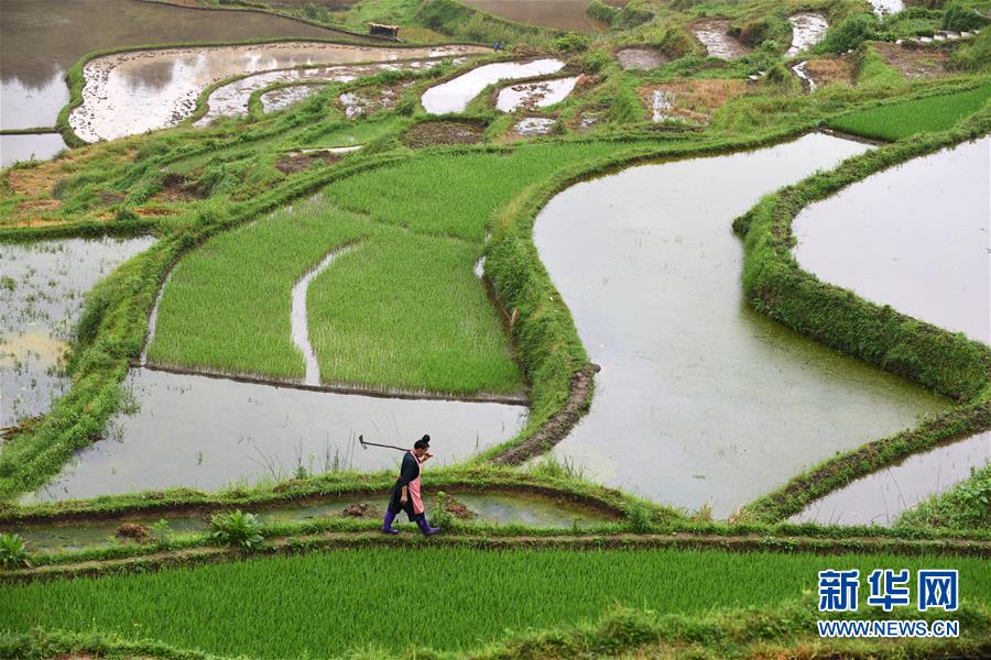 5月18日,農(nóng)民在貴州省丹寨縣龍泉鎮(zhèn)高要梯田里勞作。初夏時(shí)節(jié),位于貴州省丹寨縣龍泉鎮(zhèn)的高要梯田景色優(yōu)美。新華社記者楊文斌攝