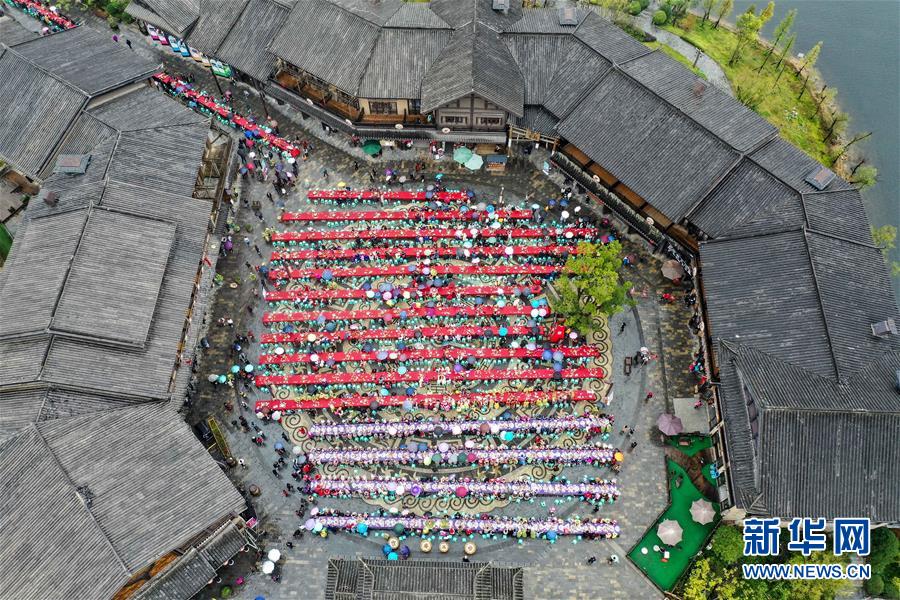 丹寨縣萬(wàn)達(dá)小鎮(zhèn)萬(wàn)人長(zhǎng)桌宴(10月26日無(wú)人機(jī)拍攝)。