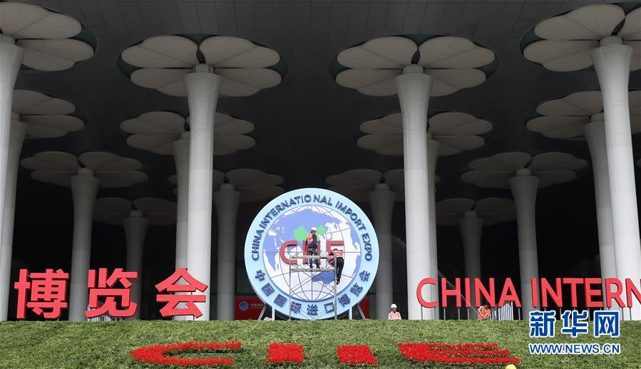這是10月25日拍攝的國(guó)家會(huì)展中心(上海)西入口處。 第二屆中國(guó)國(guó)際進(jìn)口博覽會(huì)開(kāi)幕在即,在進(jìn)博會(huì)舉辦地、國(guó)家會(huì)展中心(上海)內(nèi),展館搭建施工人員和展會(huì)志愿者們?cè)谶M(jìn)行從展臺(tái)搭建到完善觀展標(biāo)識(shí)等的布展準(zhǔn)備工作。   新華社記者 方喆攝