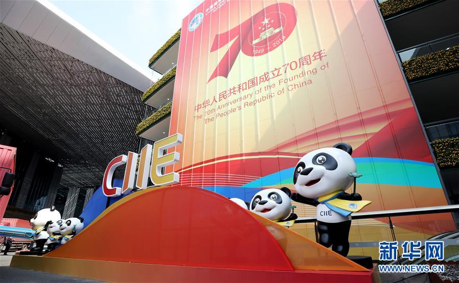 10月25日,位于國(guó)展中心內(nèi)的國(guó)家會(huì)議中心入口處張貼了醒目的進(jìn)博會(huì)吉祥物熊貓進(jìn)寶裝飾。  新華社記者 方喆攝
