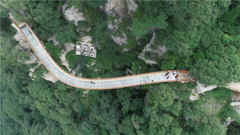 2018年6月23日,陜西渭南,游客們在少華山懸空玻璃棧道上游覽拍照。航拍少華山懸空玻璃棧道,下面就是懸崖密林。王警/視覺中國