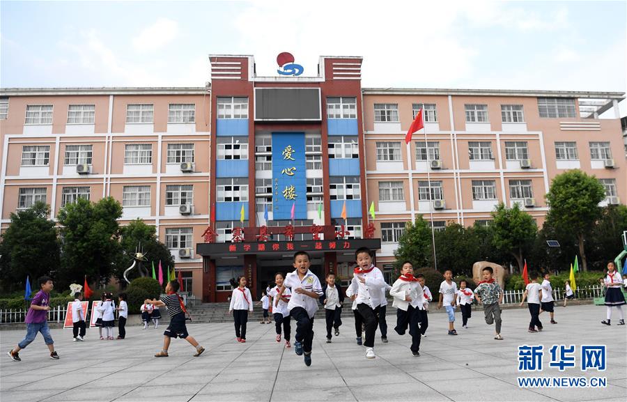 9月3日,金寨縣希望小學學生在課間玩耍。