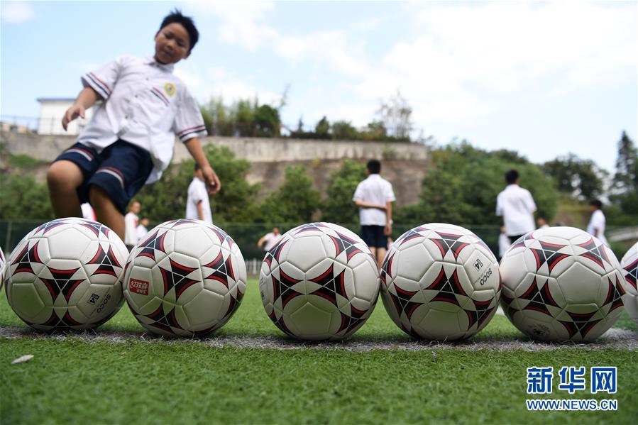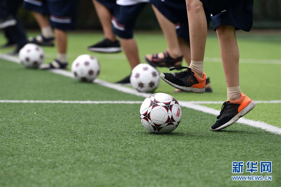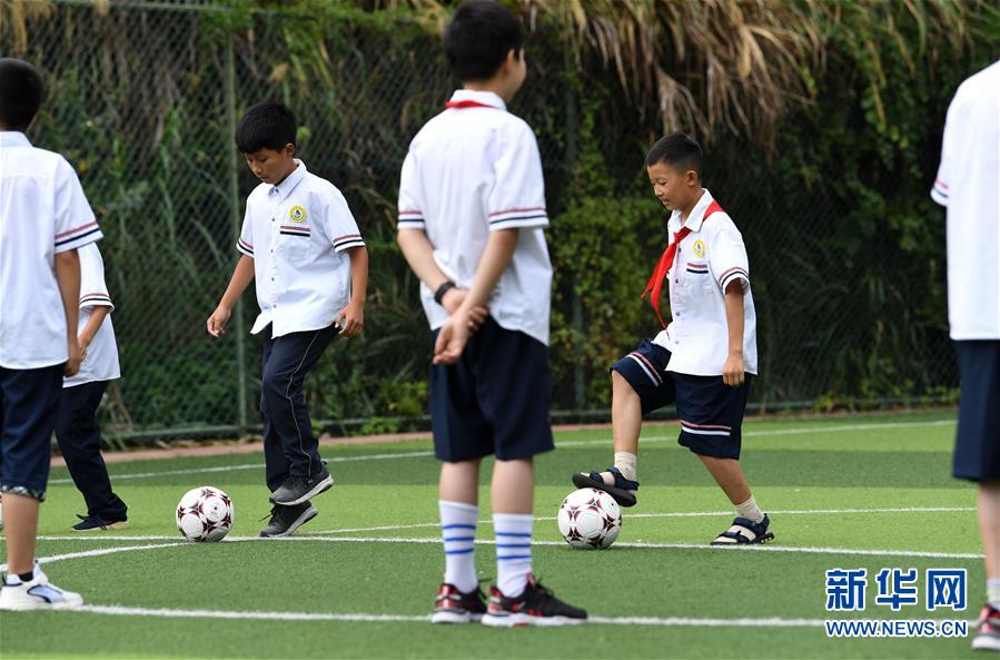 9月3日,金寨縣希望小學學生在足球課上訓(xùn)練。新華社記者張端攝
