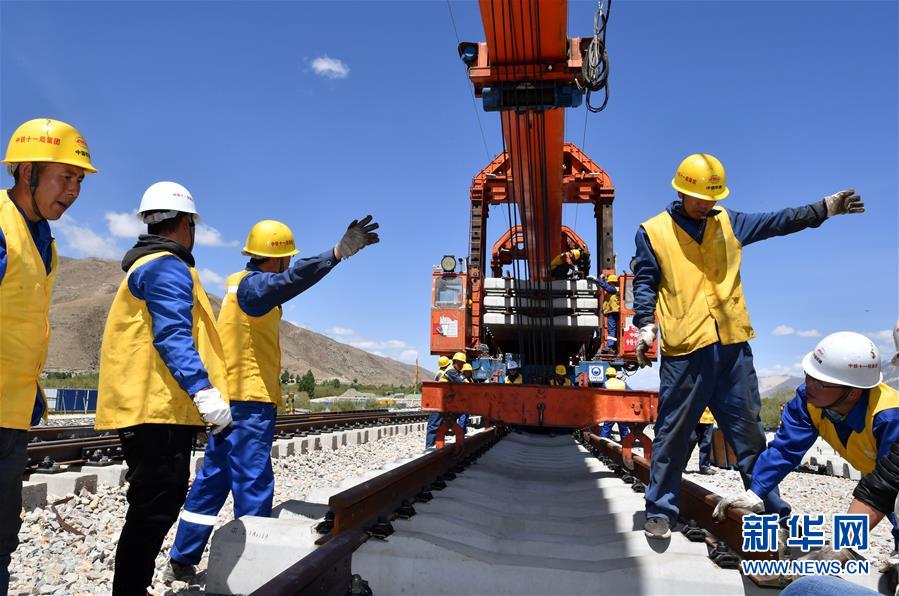 6月6日,負(fù)責(zé)鋪軌的中鐵十一局集團(tuán)的建設(shè)者在現(xiàn)場(chǎng)作業(yè)。新華社記者覺(jué)果攝