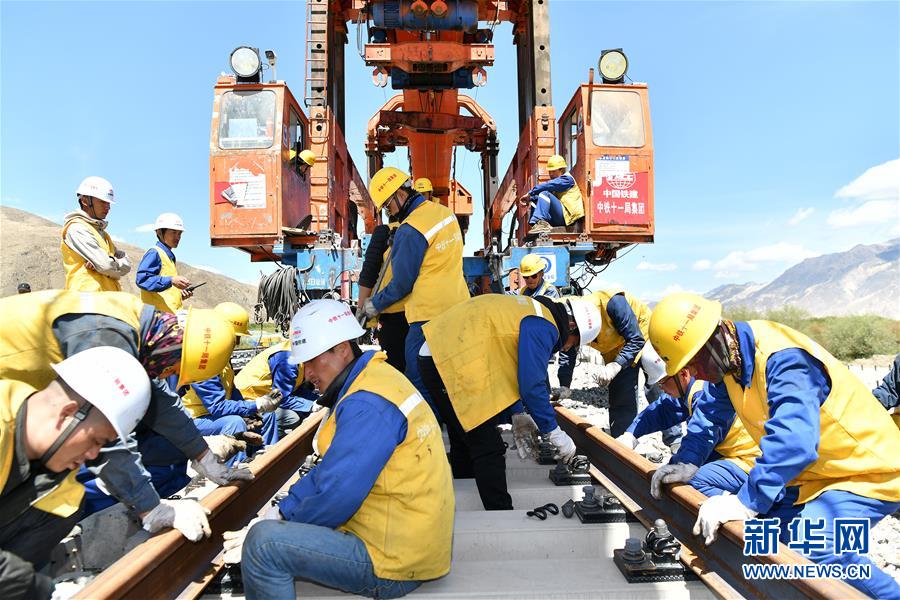6月6日,負(fù)責(zé)鋪軌的中鐵十一局集團(tuán)的建設(shè)者在現(xiàn)場作業(yè)。新華社記者李鑫攝