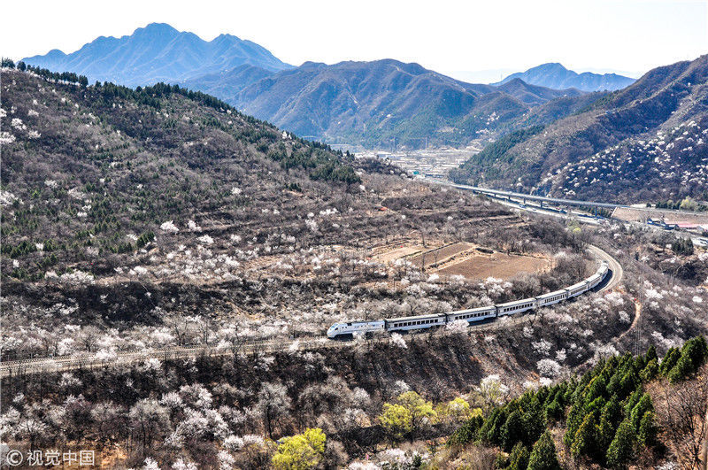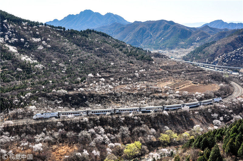 2019年3月22日,北京居庸關附近的山花盛開,S2線列車穿行在花海之中,構成一幅美麗的畫面。時永平/千龍圖像/視覺中國編輯/陳進