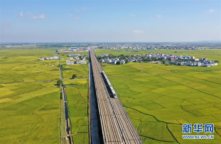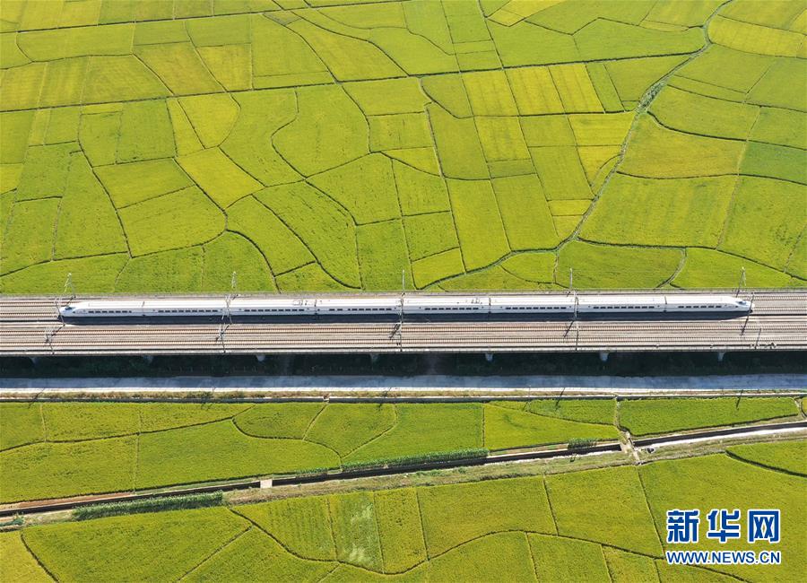 眼下,廣西賓陽縣古辣鎮(zhèn)大面積稻田進入收獲期,一列列南來北往的動車從稻田間飛馳而過,構成一幅幅美麗的豐收圖畫。