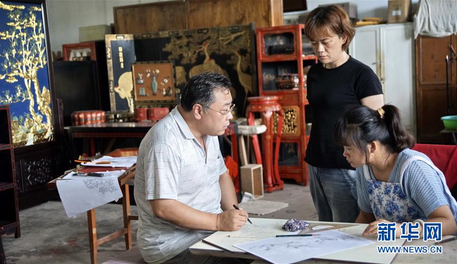 北京金漆鑲嵌有限責任公司工藝美術(shù)大師王學兵(左)在和技師們交流漆畫創(chuàng)作(10月31日攝)。新華社記者李欣攝