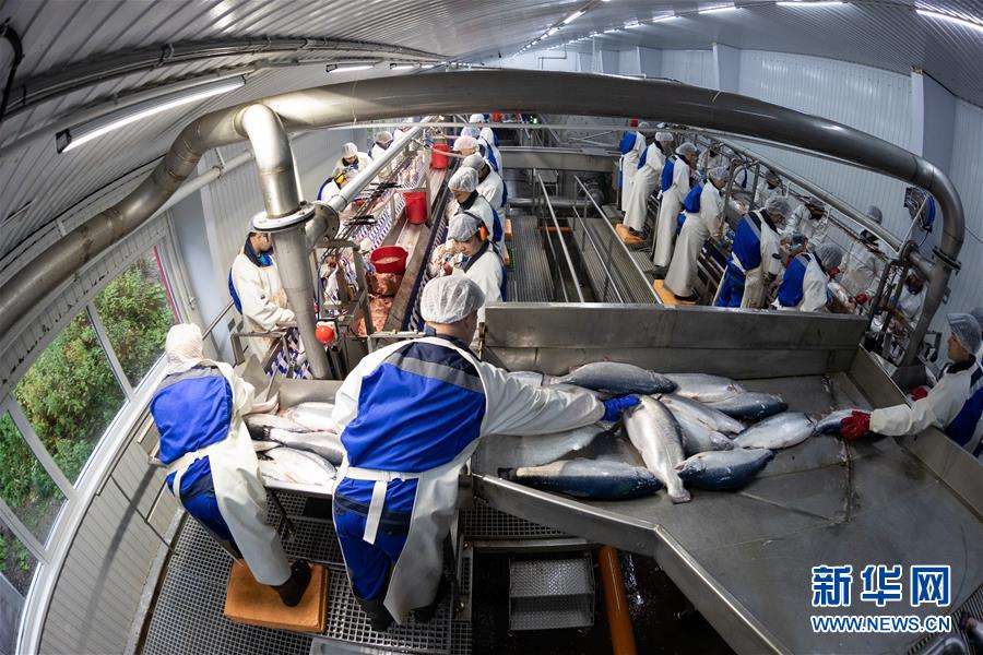 9月13日,在俄羅斯摩爾曼斯克,俄羅斯水產(chǎn)養(yǎng)殖公司工作人員在車間處理鮭魚。  新華社記者白雪騏攝