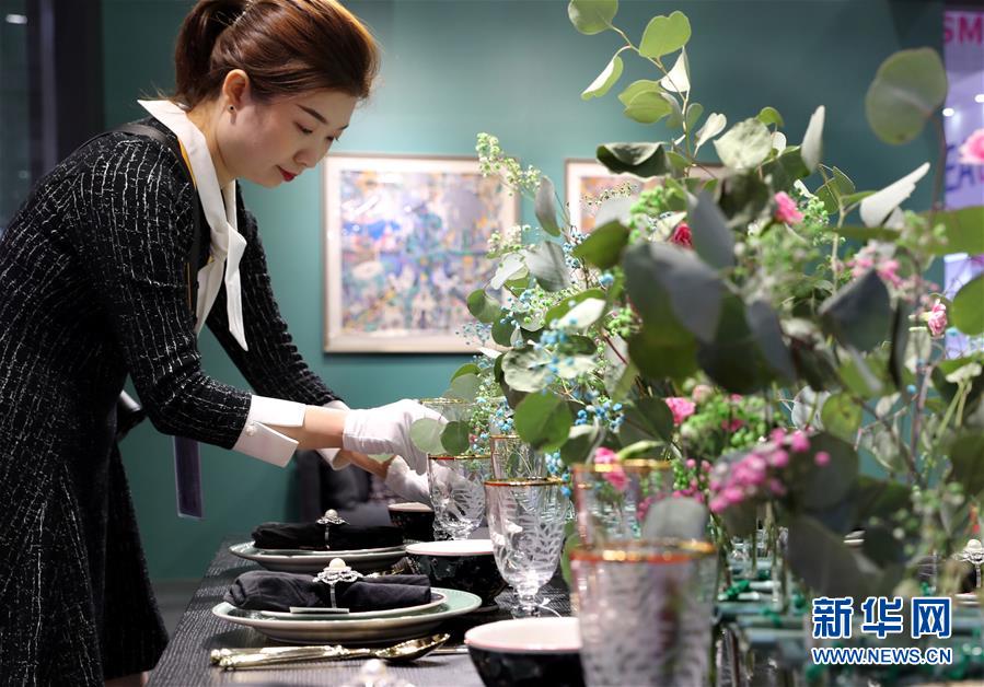 11月5日,在第二屆進博會品質生活展區(qū),工作人員在一家丹麥家居產(chǎn)品的展臺前忙碌。新華社記者劉穎攝