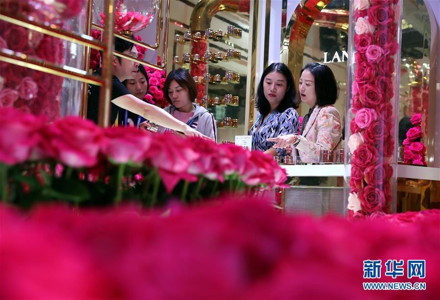 參觀者在第二屆進(jìn)博會品質(zhì)生活展區(qū)一家化妝品展臺參觀(11月6日攝)。新華社記者劉穎攝