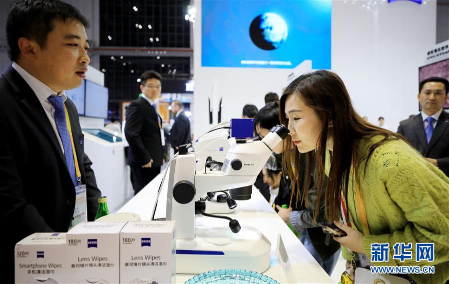 在第二屆進(jìn)博會裝備展區(qū)德國蔡司公司展臺,參觀者體驗(yàn)一款數(shù)碼互動教學(xué)系統(tǒng)產(chǎn)品(11月8日攝)。新華社記者方喆攝