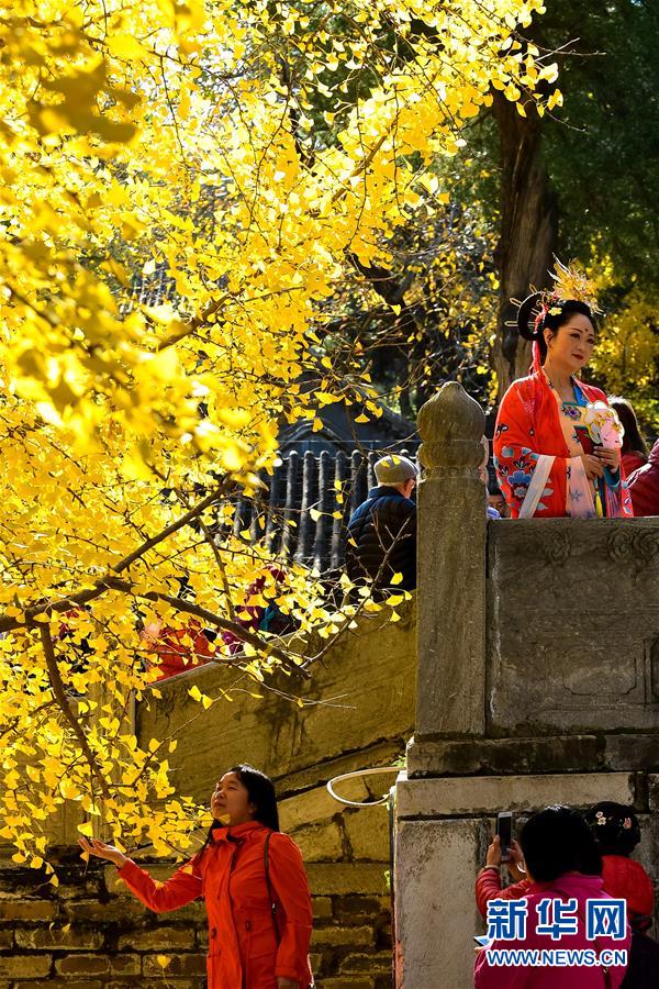 11月11日,人們在大覺寺內(nèi)的古銀杏樹旁留影。新華社記者尹棟遜攝