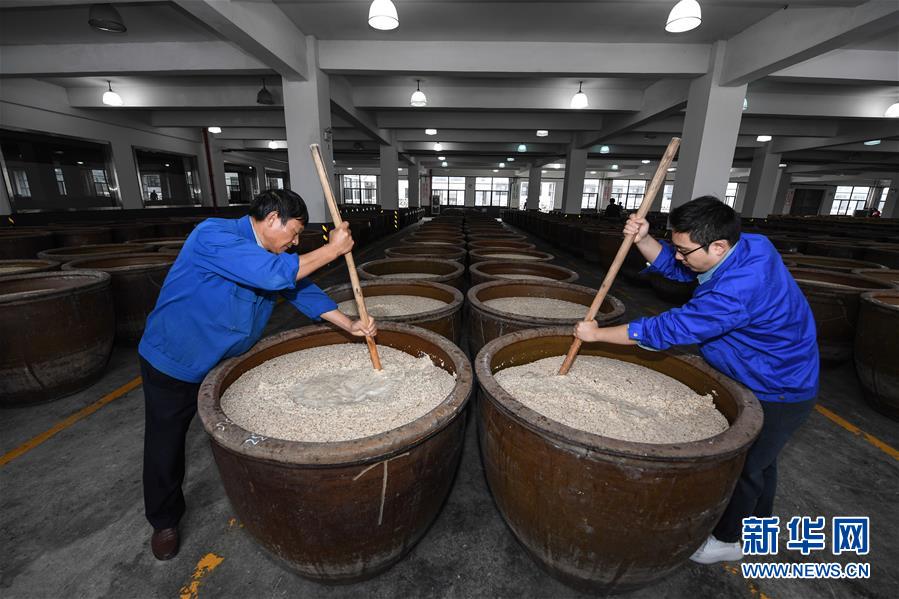 11月7日,古越龍山紹興酒股份有限公司釀酒一廠的工人進(jìn)行“開(kāi)耙”攪拌。新華社記者徐昱攝