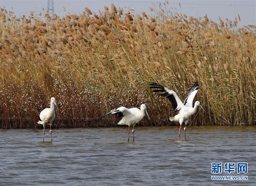 這是在樂(lè)亭縣野生動(dòng)物保護(hù)協(xié)會(huì)大清河鳥(niǎo)類救助站放飛回歸大自然的三只國(guó)家一級(jí)保護(hù)動(dòng)物東方白鸛(11月16日攝)。新華社記者楊世堯攝