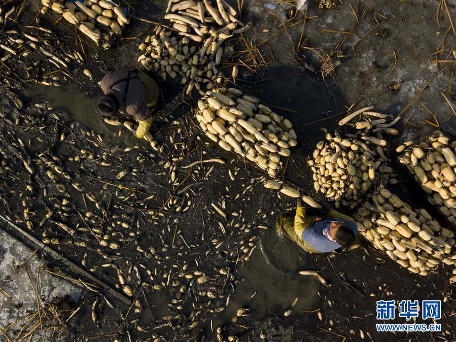 1月31日,在雄安新區(qū)安新縣東向陽村的一處藕塘,挖藕工清洗挖出來的藕(無人機航拍)。新華社記者沈伯韓攝