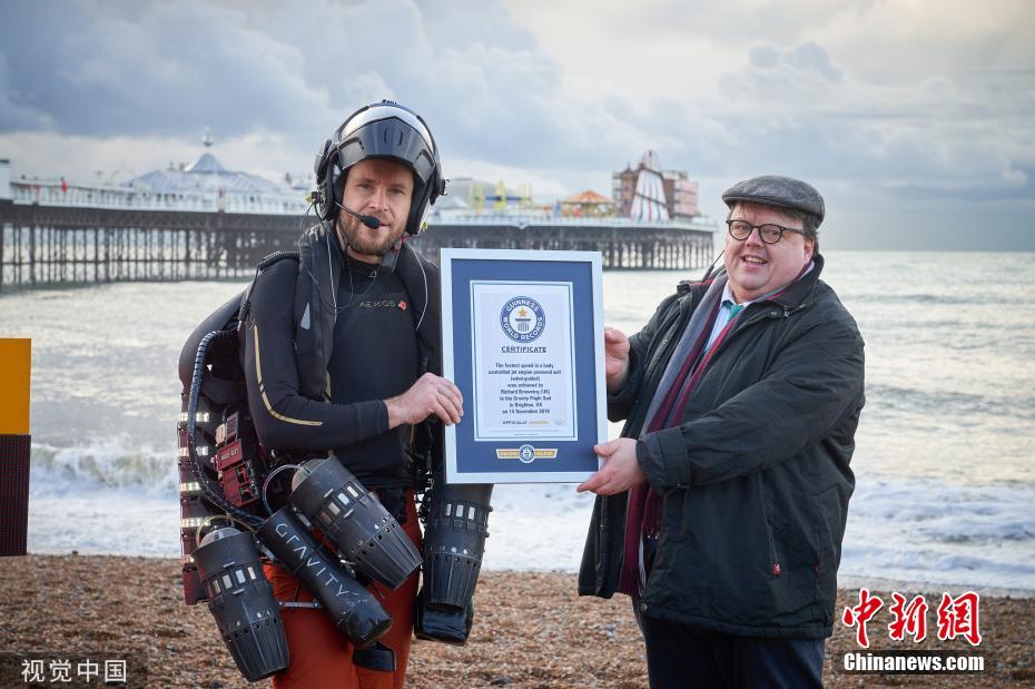 11月18日訊,英國布萊頓,英國發(fā)明家理查德·布朗寧穿著一套由身體控制、噴氣發(fā)動機驅(qū)動、風(fēng)力導(dǎo)向的飛行服,以高達(dá)每小時85.06英里(約137公里)的飛行速度,打破了自己創(chuàng)下的噴氣式飛行服速度的吉尼斯世界紀(jì)錄。圖為工作人員為理查德·布朗寧頒獎。圖片來源:視覺中國