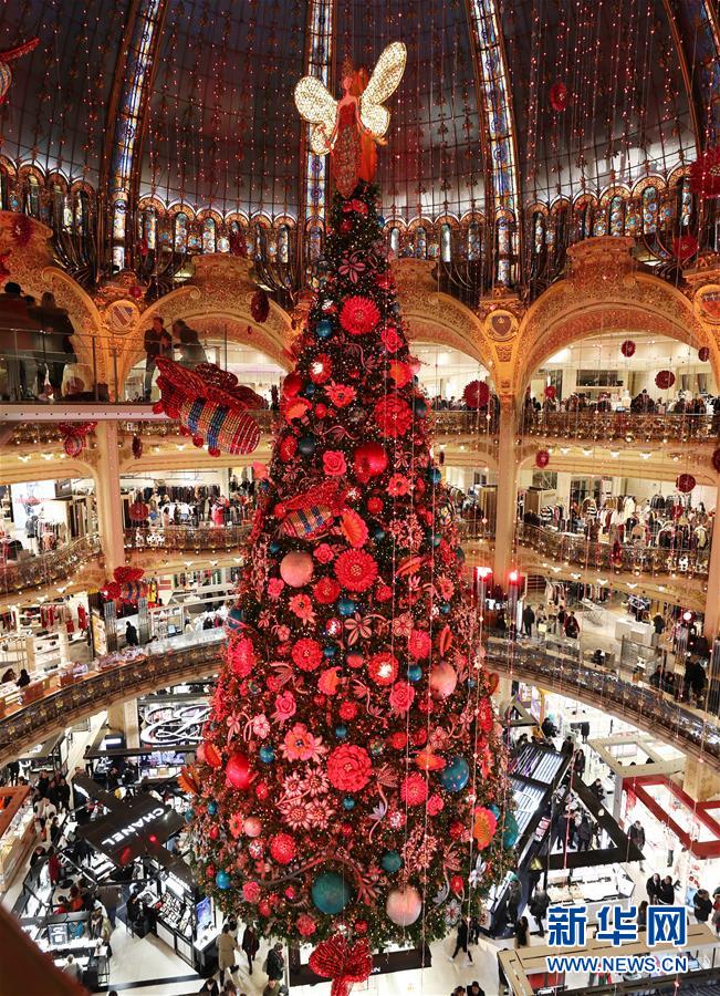 11月24日,在法國(guó)巴黎老佛爺百貨公司,人們?cè)诓Aё呃壬蠀⒂^點(diǎn)燈后的巨型圣誕樹。  新華社記者高靜攝