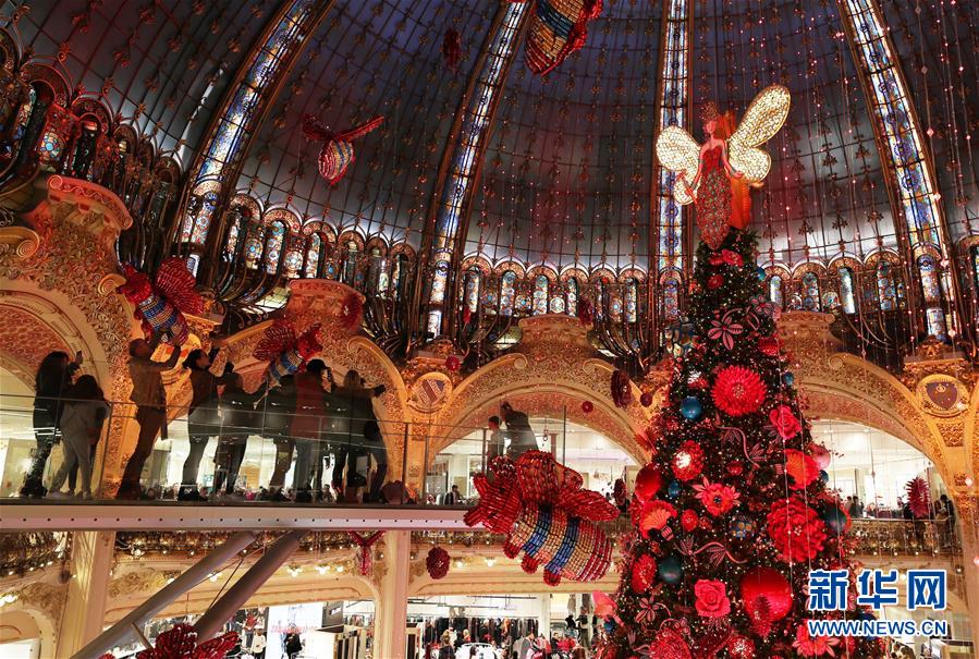 11月24日,在法國巴黎老佛爺百貨公司,人們在玻璃走廊上參觀點燈后的巨型圣誕樹。 新華社記者高靜攝