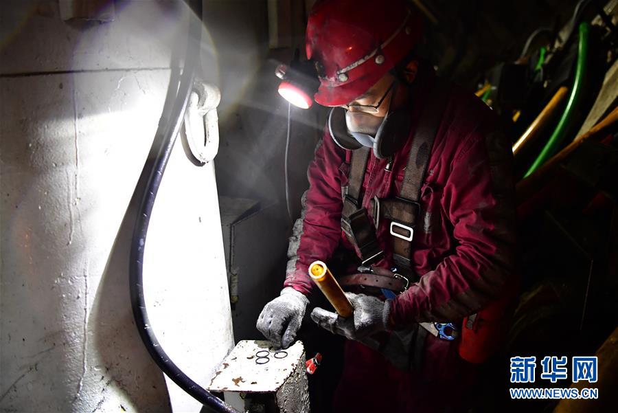 11月26日,在上灣煤礦12402綜采面內(nèi),工作人員準(zhǔn)備更換液壓支架上的零部件密封圈。 新華社記者 邵瑞 攝