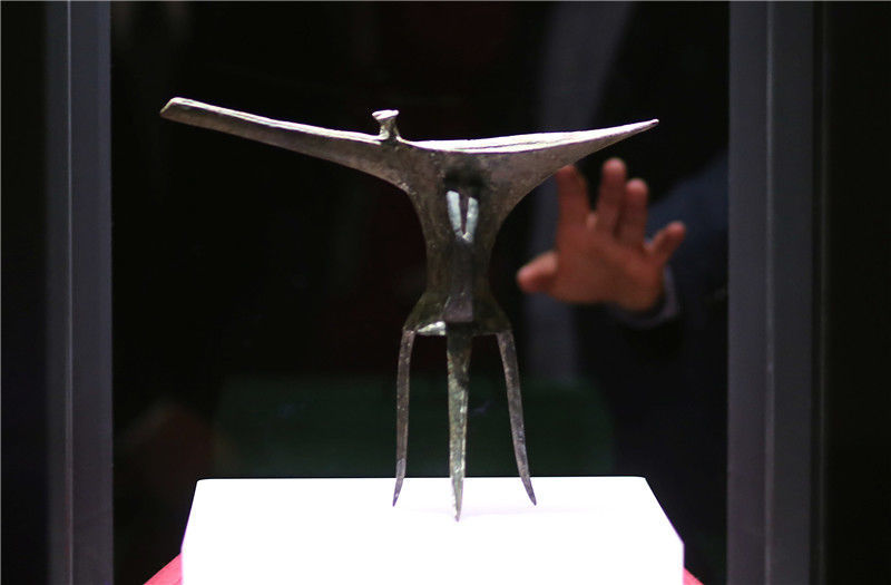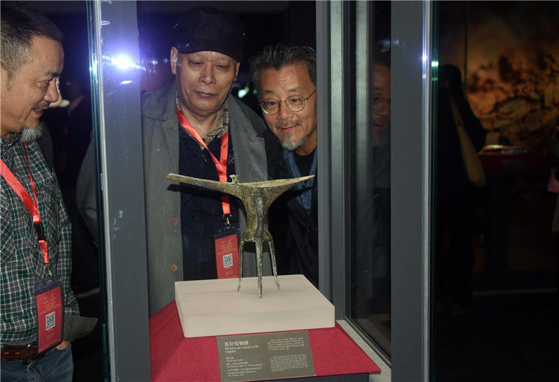 圖為參加開館儀式的專家學(xué)者參觀“鎮(zhèn)館之寶”之一的乳釘紋銅爵酒禮器(夏,二里頭文化四期)。
