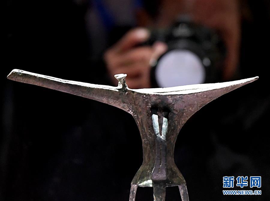 10月19日,參觀者在二里頭夏都遺址博物館內(nèi)拍攝展品“乳釘紋銅爵”。新華社記者李安攝
