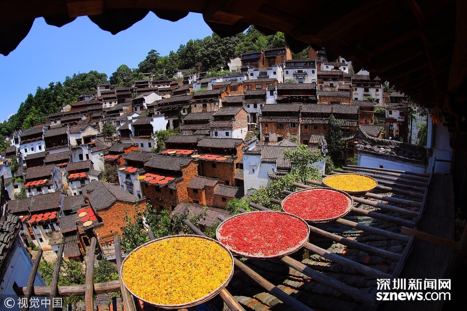 色彩斑斕的圓圓的曬匾,與依山而建的徽派古民居交相輝映,炫彩奪目。