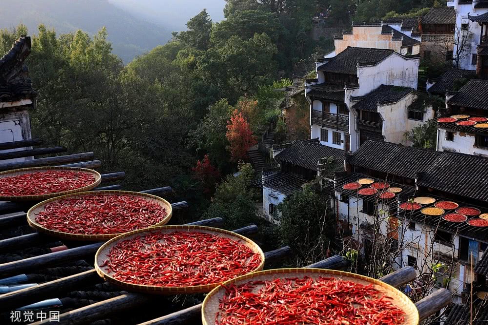 2018年8月7日,江西婺源縣篁嶺古村落,壯觀“曬秋”場景。當日立秋節(jié)氣,江西婺源縣篁嶺古村的農作物普遍豐收,村民們又迎來了一年一度的“曬秋”季。村民們將收獲來的紅辣椒、玉米、南瓜、稻谷和菊花等色彩斑斕的農作物,晾曬在依山而建的徽派民居房前屋后的木制曬架上,在秋日陽光的照射下,色彩繽紛圓圓的曬扁,鋪就在錯落有致的徽派民居之間,格外璀璨奪目,蔚為壯觀。目前,“篁嶺曬秋”已經成為中國鄉(xiāng)村旅游的一張名片。