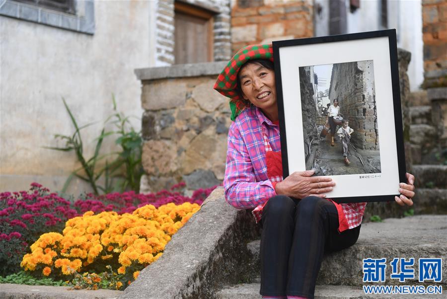 篁嶺村村民曹細(xì)香拿著2010年自己的老照片在家門(mén)前留影(11月7日攝)。新華社記者胡晨歡攝