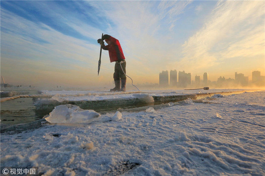2018年12月11日,黑龍江省哈爾濱市,松花江上,采冰者們彎腰拉繩,宛如纖夫般拽重達半噸的冰塊出水。采冰者都是自哈市江北萬寶、東發(fā)、沙陀子等鄉(xiāng)鎮(zhèn)的農(nóng)民,他們每年冬閑時都會親屬、村鄰之間結(jié)伴到松花江畔采冰,有的采冰人,已經(jīng)連續(xù)干了二十多年。每個采冰季,他們每天要在冰面上工作10-12個小時,每個采冰組,一天要拽出冰塊2000-3000塊,一個近20天的采冰季,每人能收入近萬元。
