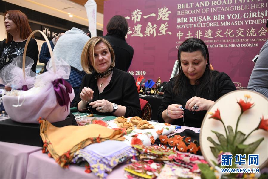 12月6日,在土耳其伊斯坦布爾,土耳其女性非物質文化遺產傳承人在交流會上展示非物質文化遺產。新華社記者徐速繪攝