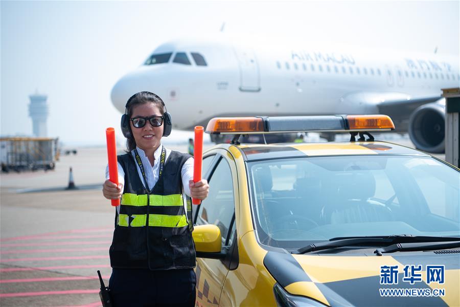 11月25日,澳門(mén)國(guó)際機(jī)場(chǎng)營(yíng)運(yùn)員鄧祺君在機(jī)場(chǎng)指揮飛機(jī)停泊,她已經(jīng)工作了3年。  新華社記者 張金加 攝