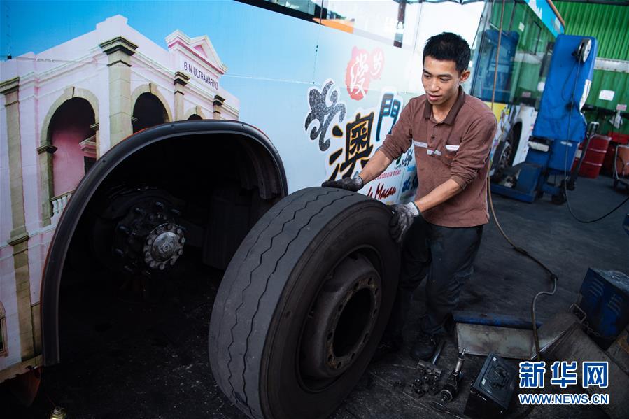 11月26日,澳門(mén)公共汽車(chē)股份有限公司鄭家松在工作,他已經(jīng)工作了2年,主要負(fù)責(zé)為公交車(chē)做定期保養(yǎng)及維修。  新華社記者 張金加 攝