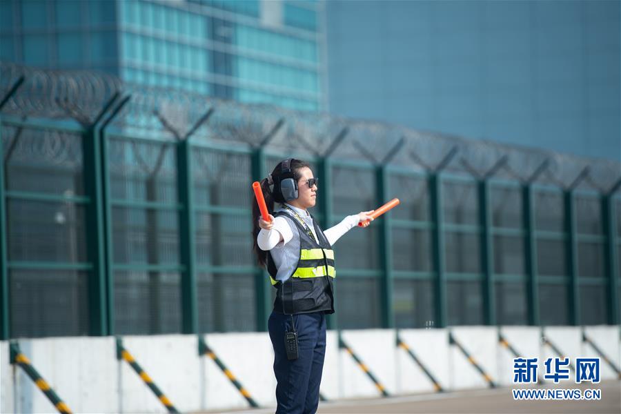 11月25日,澳門國(guó)際機(jī)場(chǎng)營(yíng)運(yùn)員鄧祺君在機(jī)場(chǎng)指揮飛機(jī)停泊,她已經(jīng)工作了3年。 新華社記者 張金加 攝