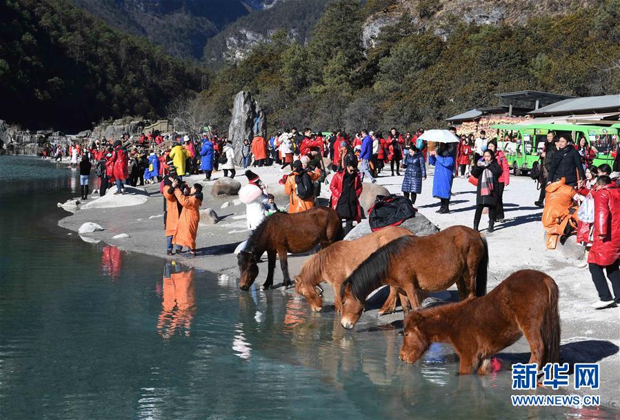 2月14日,游客在麗江玉龍雪山藍月谷游覽觀光。