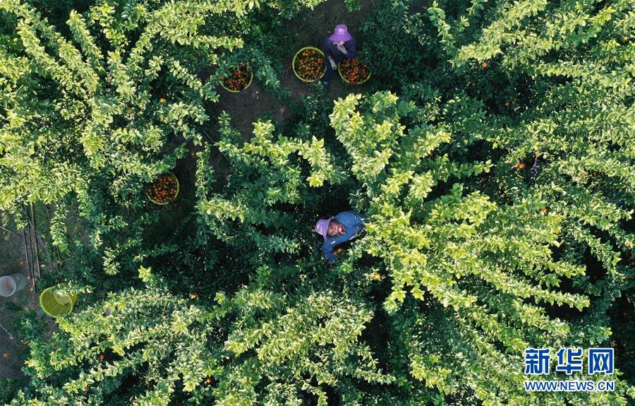 12月11日,廣西柳州市鹿寨縣四排鎮(zhèn)四排村村民在果園里采摘砂糖橘(無人機拍攝)。新華社記者 黃孝邦 攝