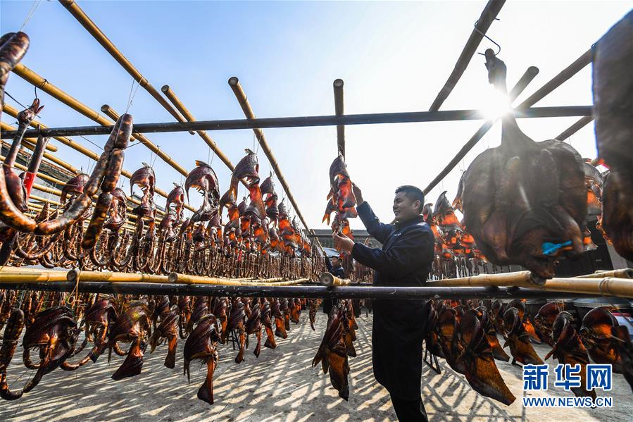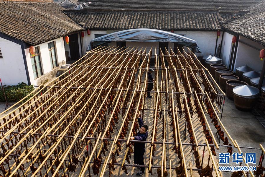 初冬時節(jié),浙江省紹興市柯橋區(qū)安昌古鎮(zhèn)開啟了傳統(tǒng)臘味制作、上市的季節(jié)。當(dāng)?shù)匕傩沼脗鹘y(tǒng)醬油、黃酒、香料等手工腌制臘腸、醬鴨、魚干、醬鵪鶉、醬排骨等紹興特色醬貨,在冬季的陽光下進(jìn)行晾曬,滿街飄香的臘味也成了這座江南古鎮(zhèn)的獨特風(fēng)景。安昌古鎮(zhèn)是浙江省歷史文化名鎮(zhèn),有著一千多年歷史,比較完善地保存了古吳越地區(qū)沿襲千百年來的民俗風(fēng)情。每年大雪節(jié)氣前后,安昌當(dāng)?shù)匕傩瞻凑諅鹘y(tǒng)習(xí)俗挑選晴朗好天氣制作、晾曬傳統(tǒng)醬貨,各類醬貨顏色黑紅油亮,咸鮮適口,是當(dāng)?shù)囟镜奶厣珎鹘y(tǒng)美食。新華社記者徐昱攝