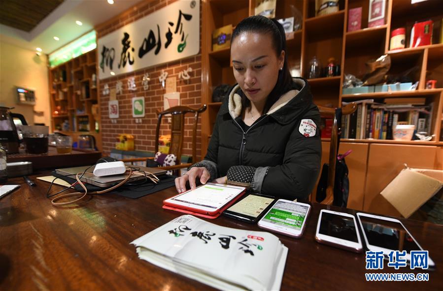 李柳萍在特產(chǎn)館里通過(guò)手機(jī)接收訂單(12月14日攝)。