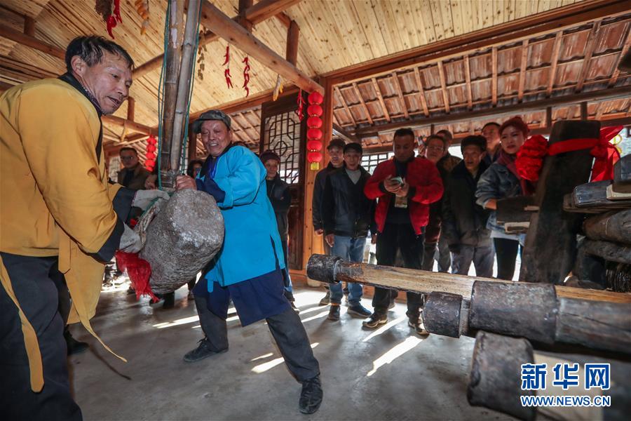 12月15日,游客在老油坊中體驗以傳統(tǒng)方式給茶籽脫殼。 新華社記者 徐昱 攝