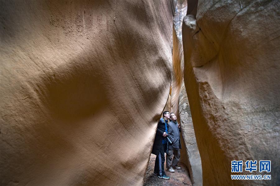 12月17日,游人在志丹縣雙河鎮(zhèn)毛項(xiàng)峽谷內(nèi)游覽。毛項(xiàng)峽谷位于陜西省延安市志丹縣雙河鎮(zhèn)毛項(xiàng)村,峽谷全長12公里,分為9段,曲折綿延,谷內(nèi)石壁凹凸不平,其中最窄處只能容一人側(cè)身通過,堪稱黃土高原上的自然奇觀。新華社記者陶明攝