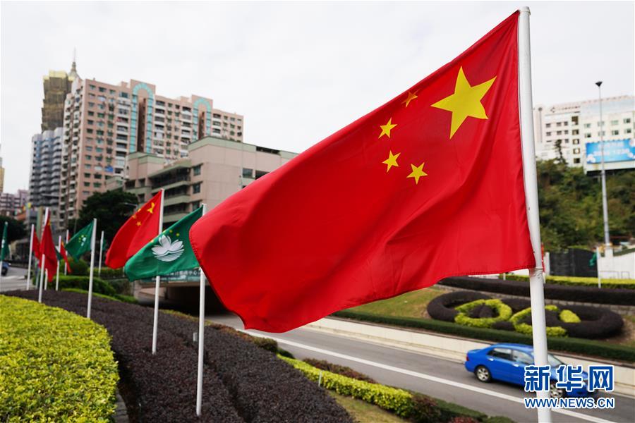 12月17日,在澳門街頭,國旗和區(qū)旗迎風(fēng)飄揚。