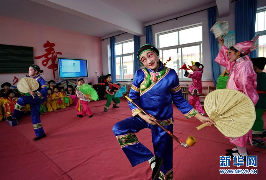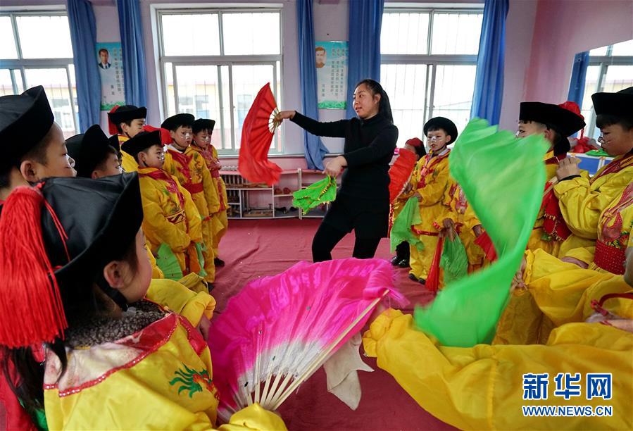 12月19日,河北省灤州市小閆營小學(xué)學(xué)生在排練地秧歌。新華社記者 牟宇 攝