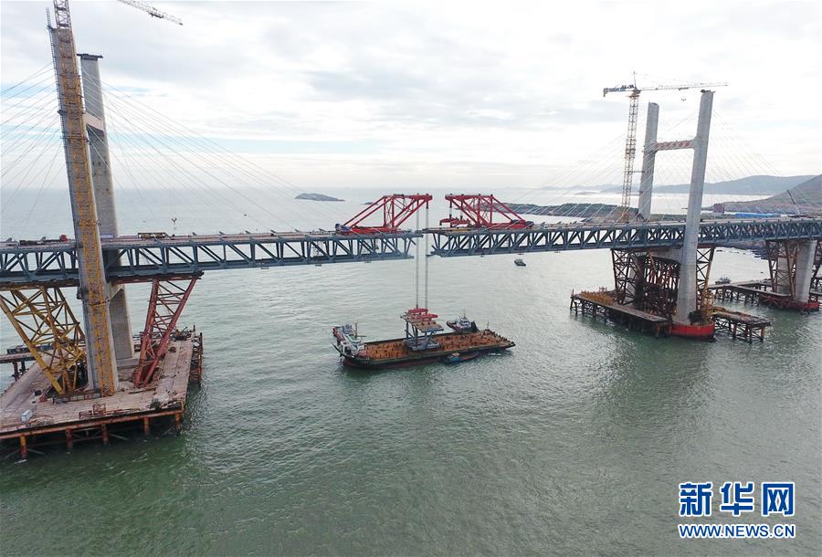 9月21日,平潭海峽公鐵大橋鼓嶼門航道橋的鋼桁梁在吊裝中(無人機拍攝)。新華社記者林善傳攝