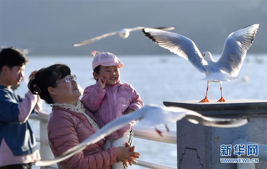 12月18日,人們在昆明海埂大壩觀賞、投喂紅嘴鷗。 近日,“春城”昆明陽光明媚,氣候宜人,市民游客紛紛來到海埂大壩、翠湖公園等地,與前來越冬的紅嘴鷗近距離接觸,人鷗同樂。紅嘴鷗是云南昆明的“榮譽市民”,每年秋冬季都會來到昆明越冬。 新華社記者 藺以光 攝