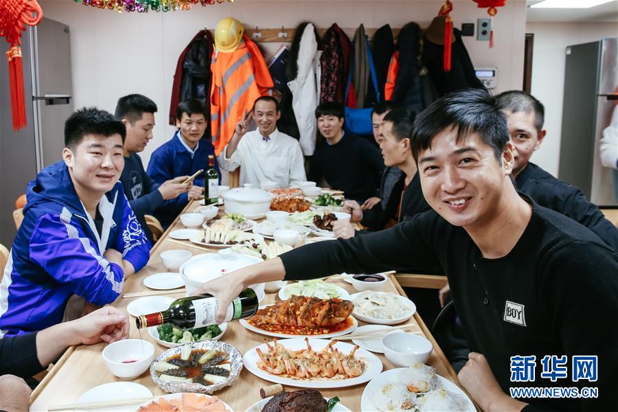 2019年2月5日,在比利時安特衛(wèi)普港,船員們在“中遠(yuǎn)海運天秤座”號餐廳里共享遲來的年夜飯。由于駛離漢堡港的時間出現(xiàn)延誤,超大型集裝箱船“中遠(yuǎn)海運天秤座”號在2月5日農(nóng)歷正月初一凌晨兩點才抵達(dá)安特衛(wèi)普港,遠(yuǎn)洋海員們終于可以開懷暢飲,歡喜過年。 新華社記者 張鋮 攝