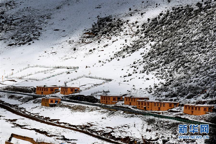 川藏線四川理塘縣境內的雪山和民居(10月17日攝)。新華社記者陳天湖攝