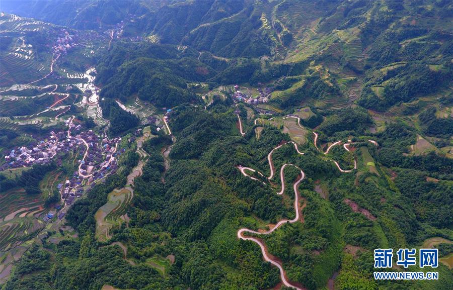 這是融水苗族自治縣桿洞鄉(xiāng)百秀村孔門苗寨的公路(6月14日無人機拍攝)。新華社記者黃孝邦攝