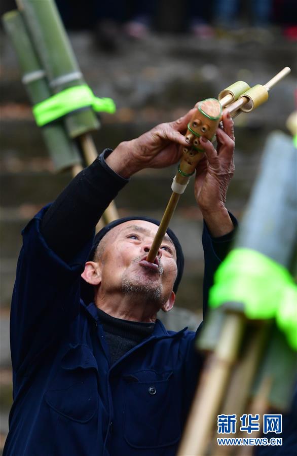 在烏英苗寨新蘆笙柱下,融水苗族自治縣苗族蘆笙音樂代表性傳承人梁安合(中)在練習(xí)吹蘆笙(12月24日攝)。新華社記者王諾攝