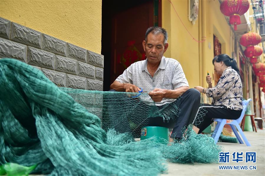 8月22日,福安市下岐村村民江銀章在修補漁網(wǎng)。新華社記者林善傳攝