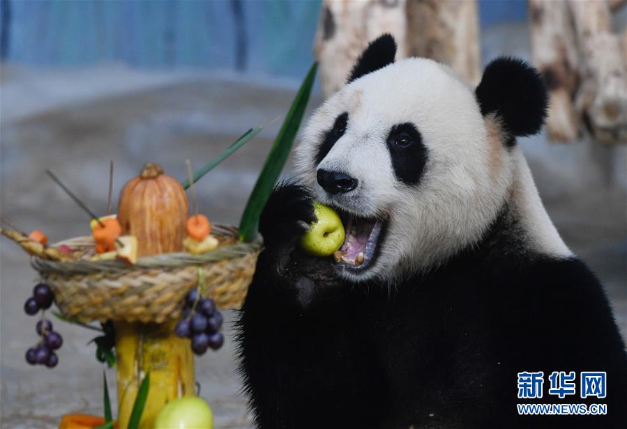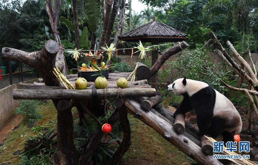當日是2019年最后一天,海南熱帶野生動植物園的工作人員為園區(qū)內大熊貓“貢貢”“舜舜”準備了用葡萄、南瓜、竹筍等果蔬制作的“火鍋串串香”,讓它們用“擼串”的方式迎接新年的到來。 新華社記者 楊冠宇 攝